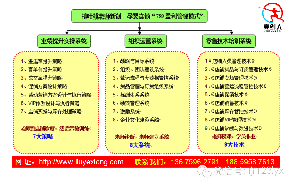 柳葉雄老師最新開發(fā)的“連鎖789盈利管理模式”從培訓+店鋪系統(tǒng)落地,從7大策略提升店鋪業(yè)績、8大系統(tǒng)完善運營系統(tǒng)、9大零售技術提升盈利能力,歡迎大家來電咨詢。本項目為老師到店鋪與公司實戰(zhàn)輔導,為此,服務對象要求直營店鋪數在5家以上的經銷商或者總代理年銷售額在3000萬以上的客戶。歡迎來電咨詢“連鎖789盈利管理模式”!