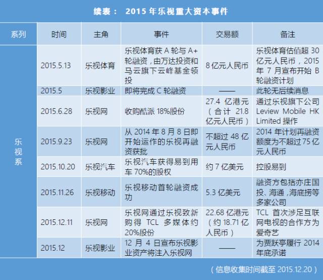 2015年度資本游戲玩得最好的仍非樂視莫屬。其子公司的融資、入股等動作,占了2015年視頻行業全部資本動作的五成以上。這里是我們收集到的樂視在年內的重大資本事件: