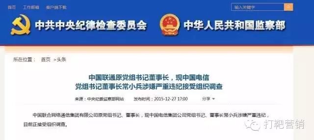 中紀委正式確認常小兵正在接受調查。今日(27日)下午5點,中紀委網站發布:“中國聯合網絡通信集團有限公司原黨組書記、董事長,現中國電信集團公司黨組書記、董事長常小兵涉嫌嚴重違紀,目前正接受組織調查。”