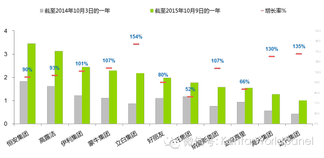 凱度消費(fèi)者指數(shù)截至2015年10月9日的52周報告顯示,共有21家快速消費(fèi)品企業(yè)擁有過億的城市購買家庭,躋攀消費(fèi)者過億瑯玡榜。而在2012年僅有15家企業(yè)進(jìn)入榜單。