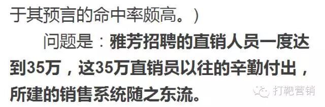 雅芳退出中國的事件發生,我們同樣要喊一些口號,以此來提醒、告戒“難民”、“乞丐”們:堅持,并不一定是正確的;方向不對,努力白費;選擇大于努力;我們可以堅持夢想,決不能堅守陣地。方法正確,事半功倍;條條大路通羅馬,最最關鍵是方法!這是錯誤地延用、借取了發達國家的直銷理念的結果。
