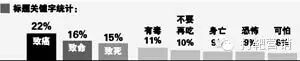 74%用了感嘆式標(biāo)題:如《不要再吃雞蛋!一個養(yǎng)雞場老板女兒帶血的懺悔和勸告!!!》;27%用了命令式標(biāo)題:如《醫(yī)院開會被偷拍,全中國人民驚呆了,往死里傳!》