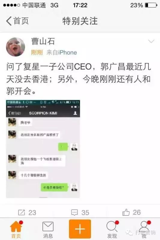 “曹山石”微博稱,“問了復星一子公司CEO,郭廣昌最近幾天沒去香港;另今晚剛剛還有人和郭開會”。在電話里“復星集團品牌總監對外卻不明確否認;梁信軍亦如是”。梁是復星集團的副董事長兼首席執行官。