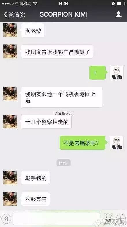 今日下午,有網友爆料“郭廣昌被抓......從香港回上海......十幾個警察押走的......”而郭廣昌的手機一直處于關機狀態。
