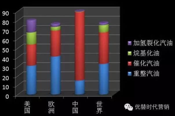 中國生產(chǎn)汽油主要是以催化裂化為主,催化汽油辛烷值相對較低,硫含量高,烯烴含量高(車用汽油中烯烴含量高達30-40%);而品質(zhì)較高的重整汽油、烷基化汽油、醚化汽油等組分占比較少。