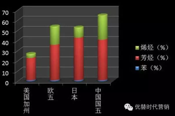 很明顯,中國燃油中除了過高的硫含量之外,芳烴和烯烴的過高含量也在嚴重威脅著人們的身體健康。