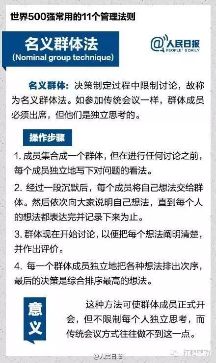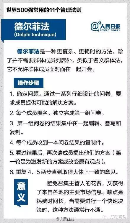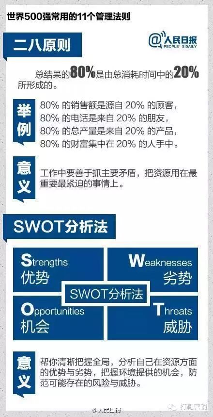 【世界500強(qiáng)都會(huì)用的11個(gè)管理法則】高效管理團(tuán)隊(duì)需要成熟的管理法則。商海沉浮,一條條久經(jīng)考驗(yàn)的管理法則一遍遍地被檢驗(yàn)和推廣,不斷創(chuàng)造價(jià)值。二八原則、魚骨圖分析法、SWOT分析法、PDCA循環(huán)規(guī)則、5W2H法、SMART原則……聽起來高大上的法則到底講了些啥?具體怎么用?
