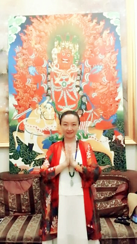 老師身后是晉美彭措法王親自畫的“馬頭明王”(注:馬頭明王(梵名Hayagriva)是觀音千千萬萬化身中之一種化相,是幫助修行者降魔除障的忿怒形相。他相貌兇惡,令人毛骨悚然。但他的忿怒形相,是為了利益眾生而現(xiàn)的,其背后是對(duì)眾生之悲心,而并非忿怒或瞋恨心。)