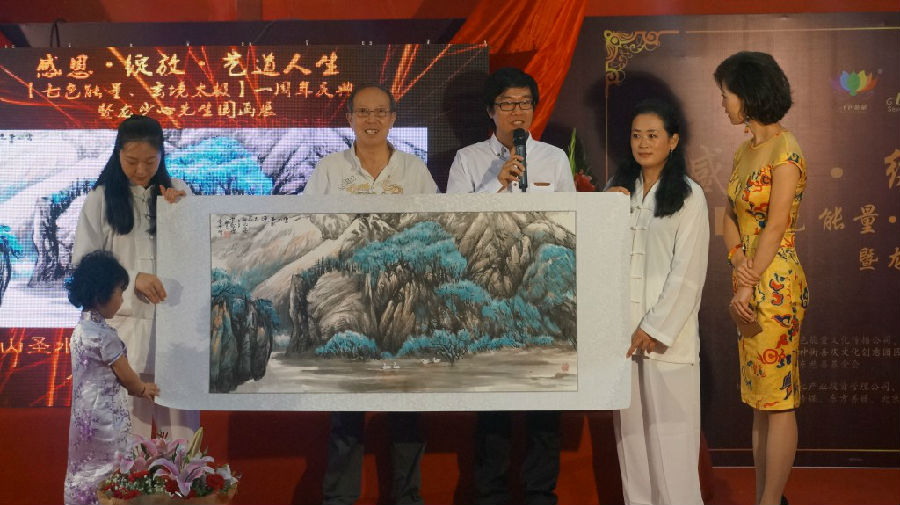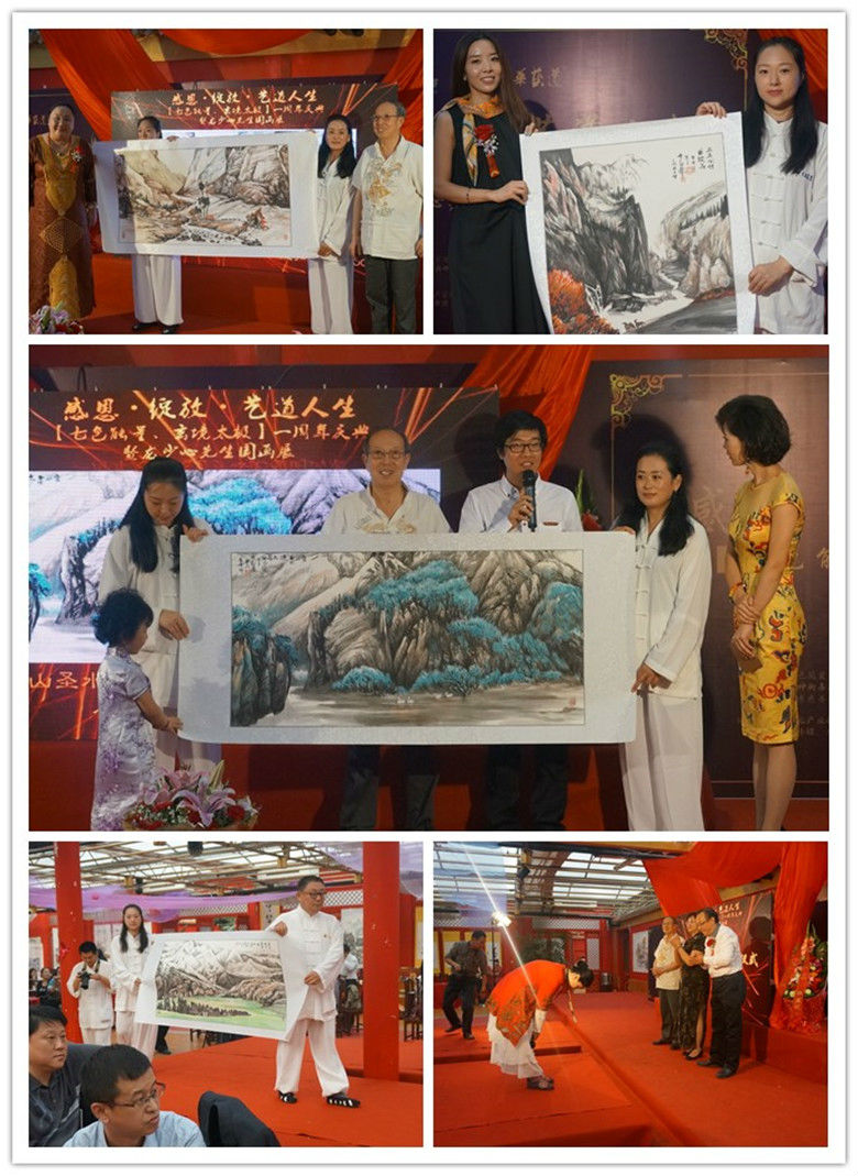 綻放——綻放七色能量,締造精彩人生。81歲大漠山水畫家龍少心先生的國畫倍受現場來賓的喜愛,來賓也深深被龍老先生的一片愛心所感動! 龍老先生的大漠山水國畫意境磅礴而深遠,國際藝商聯盟的陳鈺夫先生對于老先生的畫贊不絕口,同時也對七色能量這種弘揚中國傳統文化的行為,表示非常高興,樂于見到我們中國的傳統文化在逐步的被大眾所認知,并向世界推動。