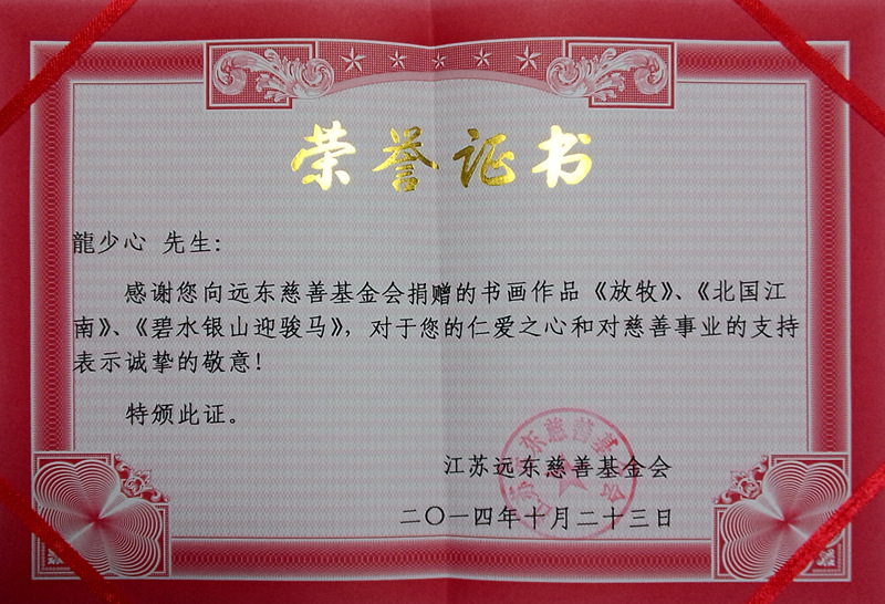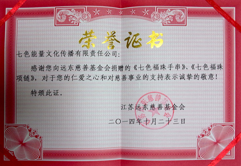 2014年9月26日七色能量在北京舉辦的“感恩·綻放·藝道人生----暨龍少心先生國畫展”的大型文化周年慶典活動,七色能量捐出值得珍藏的國畫、書法作品及七色福珠進行義拍,所拍款項捐贈遠東慈善基金專項用于資助殘疾人的培訓。遠東慈善基金的負責人劉利先生,現場對于七色能量這樣的慈善義舉給以了高度評價,并現場與七色能量總裁中國玲子老師達成合作關系。