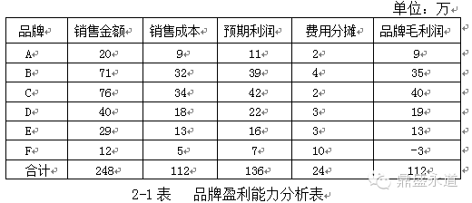 假定門店經營以下6個品牌,月度的固定費用總計24萬元,按照管理團隊決定的費用分攤模型,我們分別把24萬的費用分攤到不同的品牌上,現在我們就可以分析一下各品牌的盈利能力了。