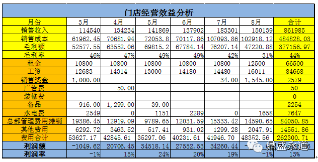 以同期歷史數(shù)據(jù)中的3月為例:門(mén)店虧損1049元,利潤(rùn)率(-1%),銷(xiāo)售收入114540元。