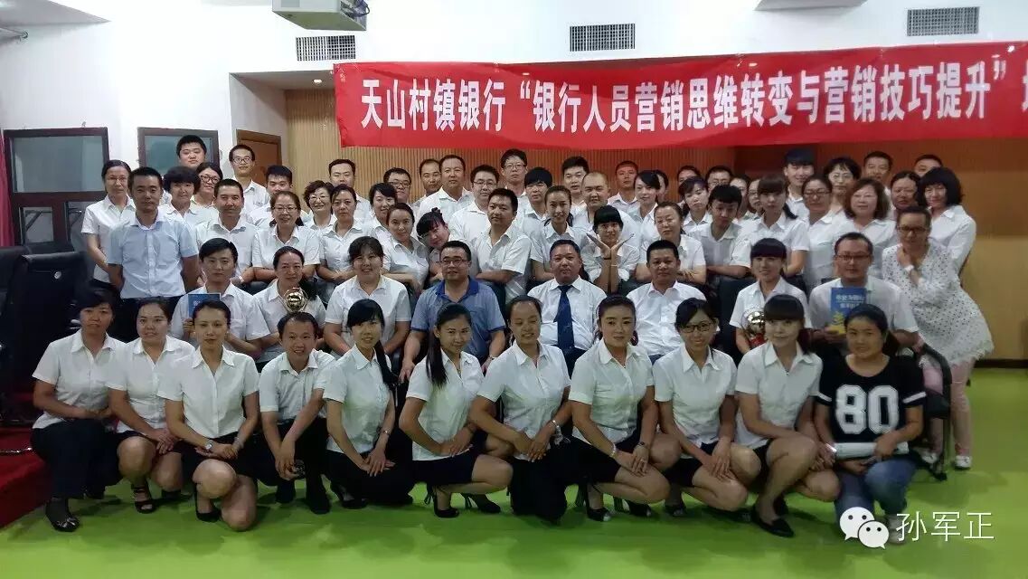 2015年8月21-22日,應新疆哈密天山村鎮銀行的邀請,銀行業績倍增系統創始人、中國執行力研究院院長、中國執行力十強講師孫軍正博士專程飛赴新疆哈密,為該行80多位管理人員及骨干員工培訓了《銀行人員營銷思維轉變與營銷技巧提升》課程,取得了預期的效果,獲得了極大成功!