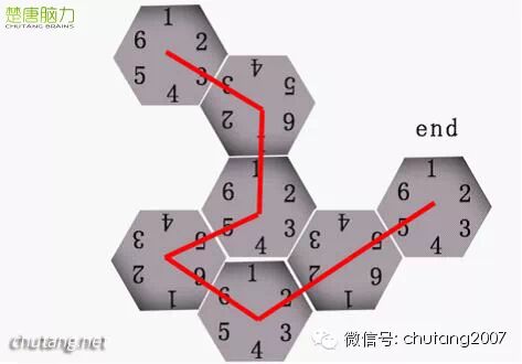 第三,對每個房間的六扇門進行數字編號。中心的六邊形,只要按照順時針或者逆時針的順序,可以任意安排,但是從第二個開始,為方便記錄,請將入口與出口的門編號保持一致,下圖紅色路線的對應數字為315625,記住路線方便,便于回憶,選手在找到第一個出口之后,要返回中心,只用了20分鐘,印證了這一點。