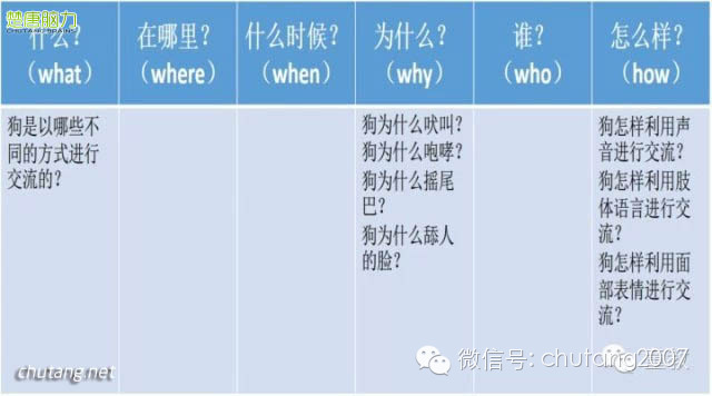 我們拿到這個題目的時候,是不是第一個問題立刻就會冒出來:狗是以哪些方式進行交流的?沒錯,我們人天生就是這么好奇的,問題很多呀。所以說,提出問題也不是大家想象的那么困難的事情,是不是?只不過沒有人從很小的時候開始就來訓練我們提出問題,分析問題和解決問題的能力,所以,我們的這種能力就會躺在我們大腦的深處自己睡覺。