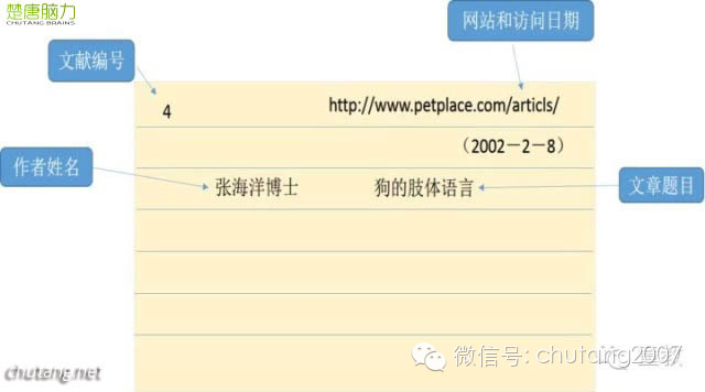 這就是文獻卡片的樣子,其實很簡單是不是,就是把要用到的文獻或者說書籍用一張卡片列出來,以便我們日后查找使用。一般來說,我們一張卡片寫一條信息。上面包含:卡片的編號,圖書館的索書號,書在哪個位置可以找到,作者的姓名,書的名稱,出版社,出版日期等信息。其它的來源都可以參考這樣的方式來制作。