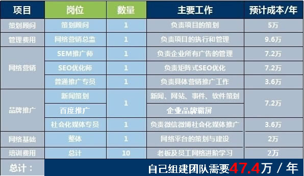 從下面這個表我們可以看到,要把網絡營銷做好,需要一個分工明確的團隊,各負其責,絕對不是一個人就能完成的;