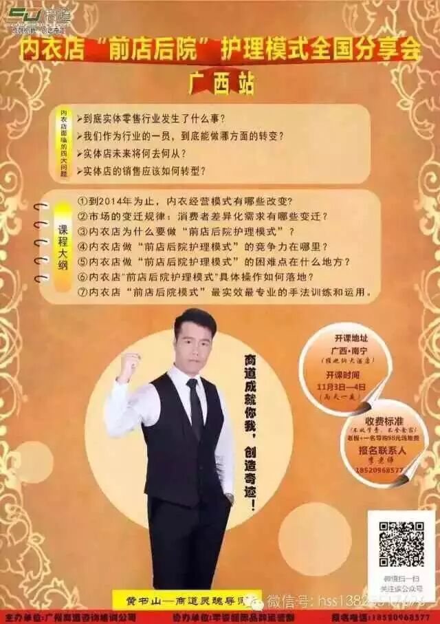 訂閱商道每天分享銷售智慧、門店管理、銷售技能、專家專欄、內衣行業(yè)動態(tài)更多資訊等內容,請?zhí)砑觼喼揿`魂導師黃書山老師個人微信號13825517696及商道公眾微信平臺:HSS13825517696,或直接掃描下面的二維碼即可直接關注.