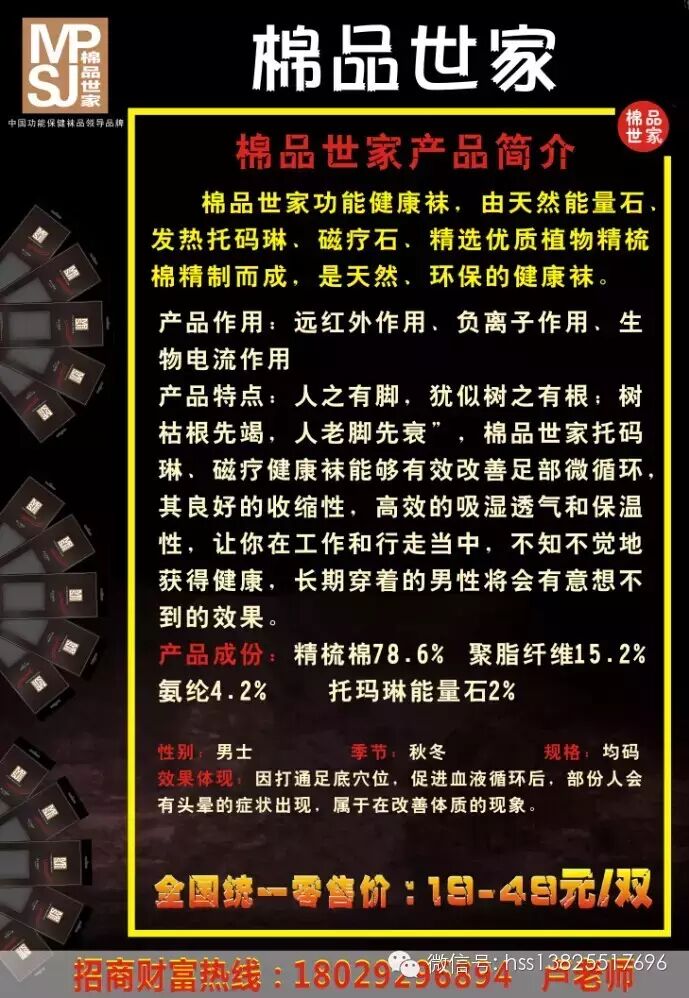 中國功能保健襪領導品牌,棉品世家的按摩保健襪蘊含著國際最尖端的技術結晶,尤其是將天然托碼琳,磁石晶體通過高科技技術形成超微細的粉末,并融合成一體,利用接柱技術使之與天然織物纖維結合,充分改善人體末梢神經足部的微循環,活化足部組織細胞,突破了傳統的以“吃”為主要保健途徑的保健理論,真正實現了人們穿著保健的夢想,為世界所矚目。