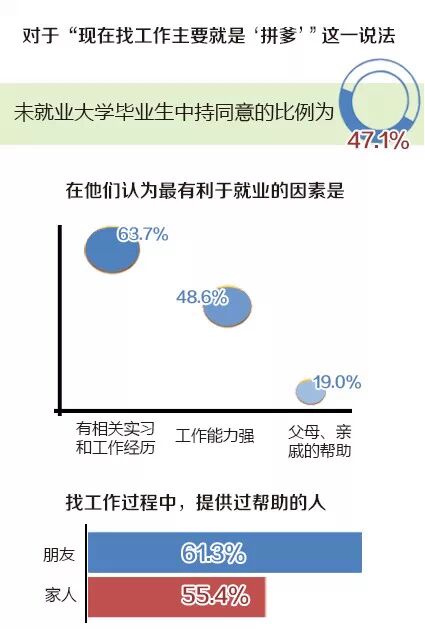 社會輿論和媒體似乎不停地暗示,“拼爹”已成為一種時代病,大學生就業更是一場“拼爹”的競賽。從這個調查中可以看出,“拼爹”的輿論背景帶給大學生先入為主的印象仍然是有的,47.1%的未就業大學生同意“現在找工作主要就是‘拼爹’”,這已是很高的比例。但所幸,現實給他們的感受要好一些,在找工作過程中,“父母、親戚的幫助”僅排在第六位,真正靠的還是經驗和能力。