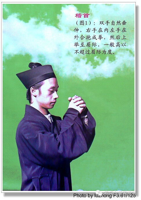 二:頭腦虛領(lǐng)有沖天之勢(shì)、下額內(nèi)收、舌頂齦交,含胸拔背而虛心下氣;手掐子午而接通陰陽(yáng)。(手掐子午就是左手抱右手,左手拇指少商穴內(nèi)側(cè)按在右手無(wú)名指根節(jié)即九宮之位處,右手拇指少商穴內(nèi)側(cè)扣住左手拇指指肚,以此溝通手肺經(jīng)氣和手少陽(yáng)三焦經(jīng)氣,達(dá)到陰陽(yáng)相和。男女左右手相反;是為手上正確的“三跪九叩”朝拜方法程序是: