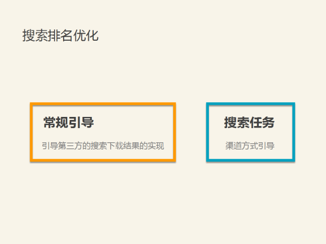 關鍵詞要怎么去優化,一種是常規引導,引導第三方的搜索下載結果實現;另一種是搜索引導,通過一些渠道引導用戶去下載。