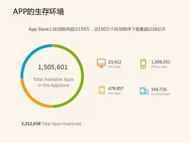 2015年10月份,數據顯示APP Store上的應用已超過150萬,這150萬應用下載量超過30億次。每天都有越來越多的APP上架,如國內游戲,每天有200-300款,如果是應用可能有500-600款,這種生態環境,對初創團隊來說,可謂是非一般的惡劣。不僅僅是對IOS端,安卓端每天的應用、競爭程度并不會比ios的低。