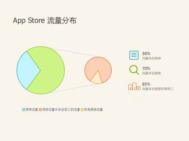 APP Store流量分布,可以了解榜單效應正在不斷地被削弱,流量獲取有30%是來自榜單,70%來自搜索,而這些85%流量來自于搜索結果的前三名,很明顯要獲取一些較大的用戶量要從搜索方面去優化,去占據一些比較有利的位置才能獲取比較好的流量。