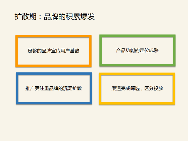 品牌要有大的爆發,企業需具備一個因素,你的用戶基數是可控宣傳資源,幫助你品牌擴張。如果沒有足夠的用戶基數,哪怕創意再好,內容再好,也只能局限在小部分用戶范圍,沒有什么作用;其次是產品功能的定位成熟;然后是在這個階段用戶新增已達到一個瓶頸,這時候推廣更注重品牌的沉淀擴散;最后是渠道完成篩選,區分投放。