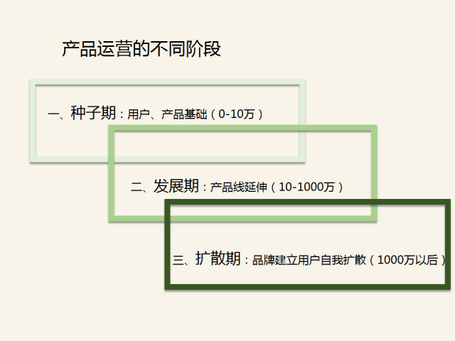 一般的產品運營的幾個階段,分為種子期、發展期、擴散期。