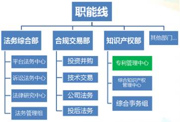 通過上圖可知,騰訊的知識產權部下設專利管理中心、綜合知識產權管理中心、綜合事務組。其中,專利管理中心主要負責專利挖掘、專利預警、競爭對手專利跟蹤、國內和國際專利布局、專利保護等專利相關工作。綜合知識產權管理中心和綜合事務組主要負責版權、商標、域名等非技術類知識產權管理相關工作。
