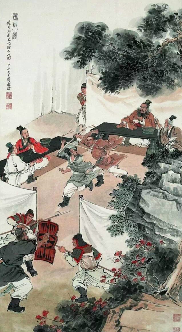 鴻門宴上,雖不乏美酒佳肴,但卻暗藏殺機,項羽的亞父范增,一直主張殺掉劉邦,在酒宴上,一再示意項羽發令,但項羽卻猶豫不決,默然不應。范增召項莊舞劍為酒宴助興,趁機殺掉劉邦,項伯為劉邦,也撥劍起保護舞,掩護了劉邦,在危急關頭,劉邦部下樊噲帶劍擁盾闖入軍門,怒目直視項羽,項羽見此人氣度不凡,只好問來者為何人,當得知為劉邦的參乘時,即命賜酒,樊噲立而飲之,項羽命賜豬腿后,又問能再飲酒嗎,樊噲說,臣死且不避,一杯酒還有什么值得推辭的。樊噲還乘機說了一通劉邦的好話,項羽無言以對,劉邦乘機一走了之。劉邦部下張良入門為劉邦推脫,說劉邦不勝飲酒,無法前來道別,現向大王獻上白璧一雙,并向大將軍范增獻上玉斗一雙,請您收下。不知深淺的項羽收下了白壁,氣得范增撥劍將玉斗撞碎。