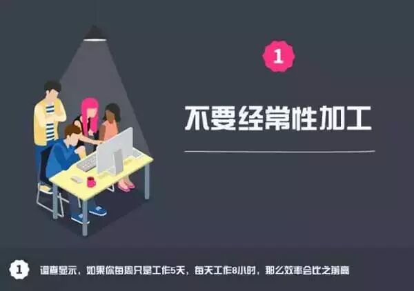 很多管理者錯誤地以為加班是增加產出的唯一方法!而今天我們發現這卻是其中最“笨”的一種方法,在訴求創新、跨界與顛覆的互聯網+時代,我們的確應該換一種視角來看待工作效率這個關鍵詞~~~