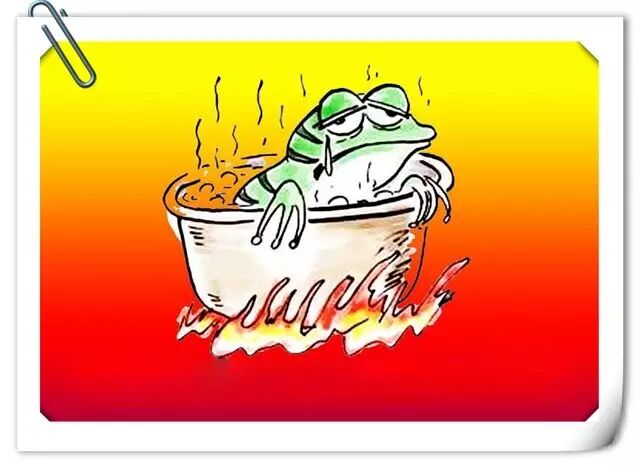 做生物實驗時,把一只青蛙放進裝有沸水的杯子時,青蛙馬上跳出來,但把一只青蛙放在另一個溫水的杯子中,并慢慢加熱至沸騰,青蛙剛開始時會很舒適地在杯中游來游去,到它發(fā)現(xiàn)太熱時,已失去力量跳不出來了。