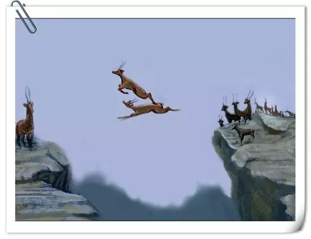 七八十頭斑羚被獵人逼到峽谷的懸崖邊,單只的斑羚能力不足以跳過峽谷到達對岸,斑羚們?yōu)榱朔N族的生存,選擇了犧牲一半,保存另一半的方法。在頭羊一只老雄羚的帶領下,一只斑羚先跳起,在跳躍到高點的時候,另一只起跳,踩著前一只斑羚的背,以此為跳板,到達對岸。