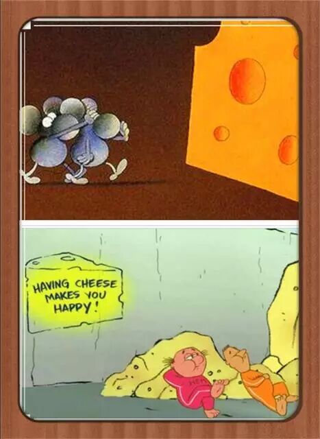 在在著名的《誰動了我的奶酪》當中描述著:嗅嗅、匆匆兩只小老鼠和哼哼、唧唧兩個小矮人在迷宮中找尋自己奶酪,有一天,他們同時發(fā)現(xiàn)了一個儲量豐富的奶酪倉庫,便在其周圍構筑起自己的幸福生活。很久之后的某天,奶酪突然不見了!嗅嗅、匆匆隨變化而動,立刻穿上始終掛在脖子上的鞋子,開始出去再尋找,并很快就找到了更多的奶酪;兩個小矮人哼哼和唧唧面對變化卻猶豫不決,他們抱怨著,無法接受奶酪已經(jīng)消失的殘酷現(xiàn)實。