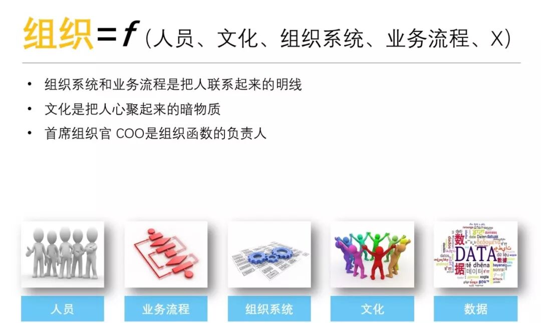 如果我們運用點高中數學水平的話,更準確的定義應該是:組織 = f(人員、文化、組織系統、業務流程、X)。首席組織官COO就是這個組織函數的負責人。他/她可以調整的變量有五個:人員、文化、組織系統、業務流程、X。X是什么?每個企業及每個創始人都有其特別的東西。這個X可能是數據,可能是其它。