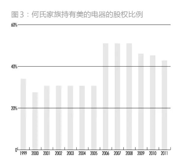 大膽引入職業經理人機制且高度分權自治的背后,何享健不可能沒有更深層次的有關控制權的考慮。實現控制權的有效武器就是高度集中的股權。何氏家族主要通過美的集團控股美的電器。股權過于稀釋將使何享健無法完全掌控經理人,失去對企業戰略方向和重大決策的掌控。為了鞏固第一大股東的地位,何享健從2006年2月23日起先后8次通過協議受讓或在二級市場上增持美的股票,控股比例一直未低于40%,實現了股權的高度集中。與之相對應的是前十大股東中,除了大股東和開聯實業(何氏控制),其余在股改后的持股比例之和一直處于下降狀態,2011年更是只有9.98%,公司股權高度集中現象更加突出。2005年何享健卸任美的電器總裁,退出日常經營管理后,持股比例顯著上升(圖3)。