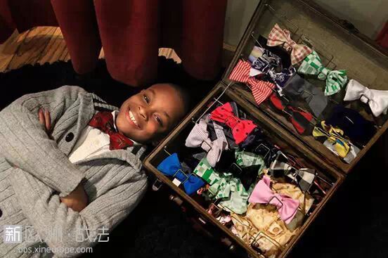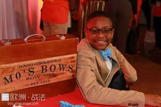 就是這個(gè)小孩兒,照片上看起來好成熟穩(wěn)重霸道總裁哦~人家叫Moziah Bridges,今年13歲,已經(jīng)有了自己公司和品牌啦,就是后面那個(gè)箱子上寫的:“Mo's Bows Mo的蝴蝶領(lǐng)結(jié)”。