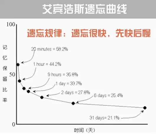 德國心理學家艾賓浩斯(H.Ebbinghaus)用無意義音節作材料,研究了遺忘進程與規律,根據結果繪成描述遺忘進程的曲線,即著名的艾賓浩斯記憶遺忘曲線。艾賓浩斯研究發現,遺忘在學習之后立即開始,而且遺忘的進程并不是均勻的。
