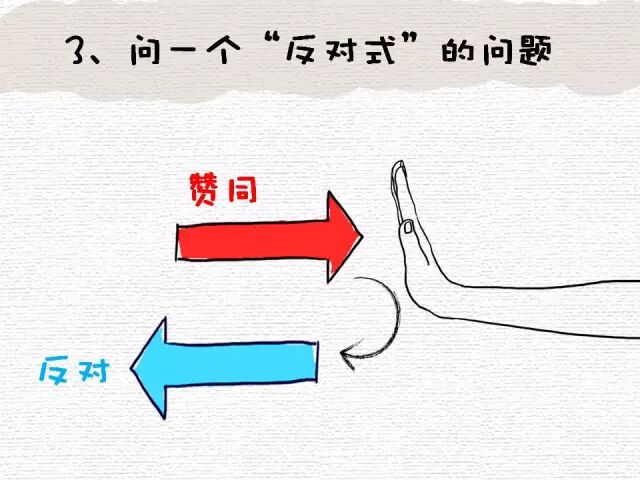 如果你想征求意見并獲得支持,有兩種語言模式:1.贊成的舉手;2.反對的舉手?你覺得那種方式更容易通過呢?這就是“反對式”提問的秘密~,這種方式特別適合在眾口難調的問題上,例如:去哪兒旅游,吃飯、電影、逛街等~