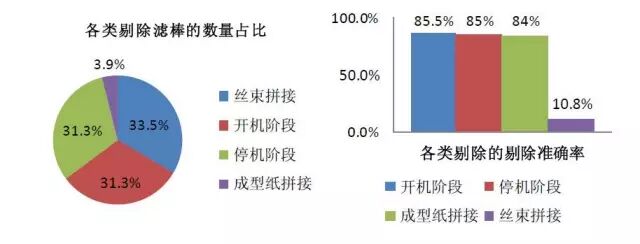 國家局2013年提出“精益管理”思想后,為進一步消除浪費,全面提升產品制造水平,實現(xiàn)精益生產,卷包車間于2013年3月成立合力QC小組,深入挖掘AF4-KDF4成型機在濾棒消耗與質量等方面存在的不足。小組對濾棒質量和消耗數(shù)據(jù)進行統(tǒng)計分析,發(fā)現(xiàn):絲束拼接時產生的濾棒消耗較大,占33.5%,且剔除準確率只有10.8%,大量合格濾棒被誤剔除。另外,通過FEMA分析發(fā)現(xiàn):濾棒中含絲束拼接頭的質量風險(RPN風險順序數(shù)108)超過了車間質量管理要求。由此,小組展開了研究。