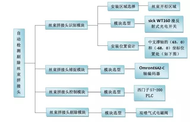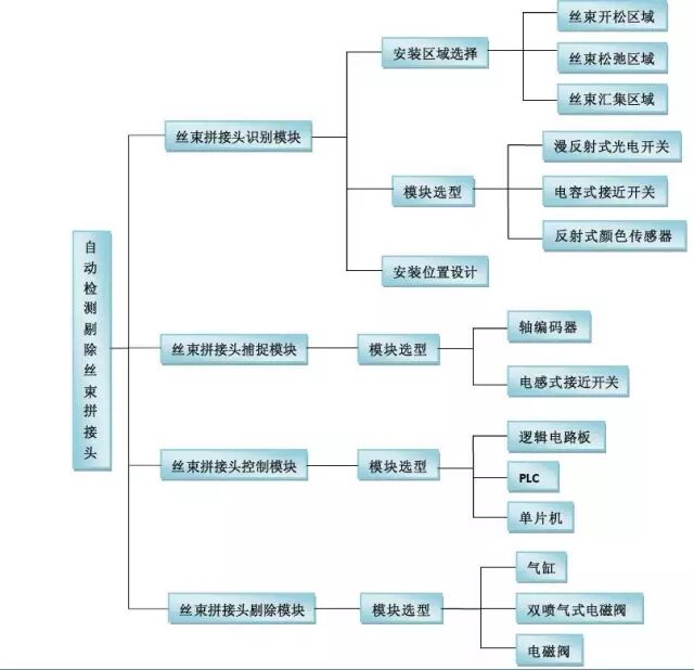 小組成員通過頭腦風暴法,運用親和圖列出自動剔除功能的技術需求點,以及各功能模塊。最終確定四個模塊:絲束拼接頭識別模塊、捕捉模塊、控制模塊和剔除模塊。